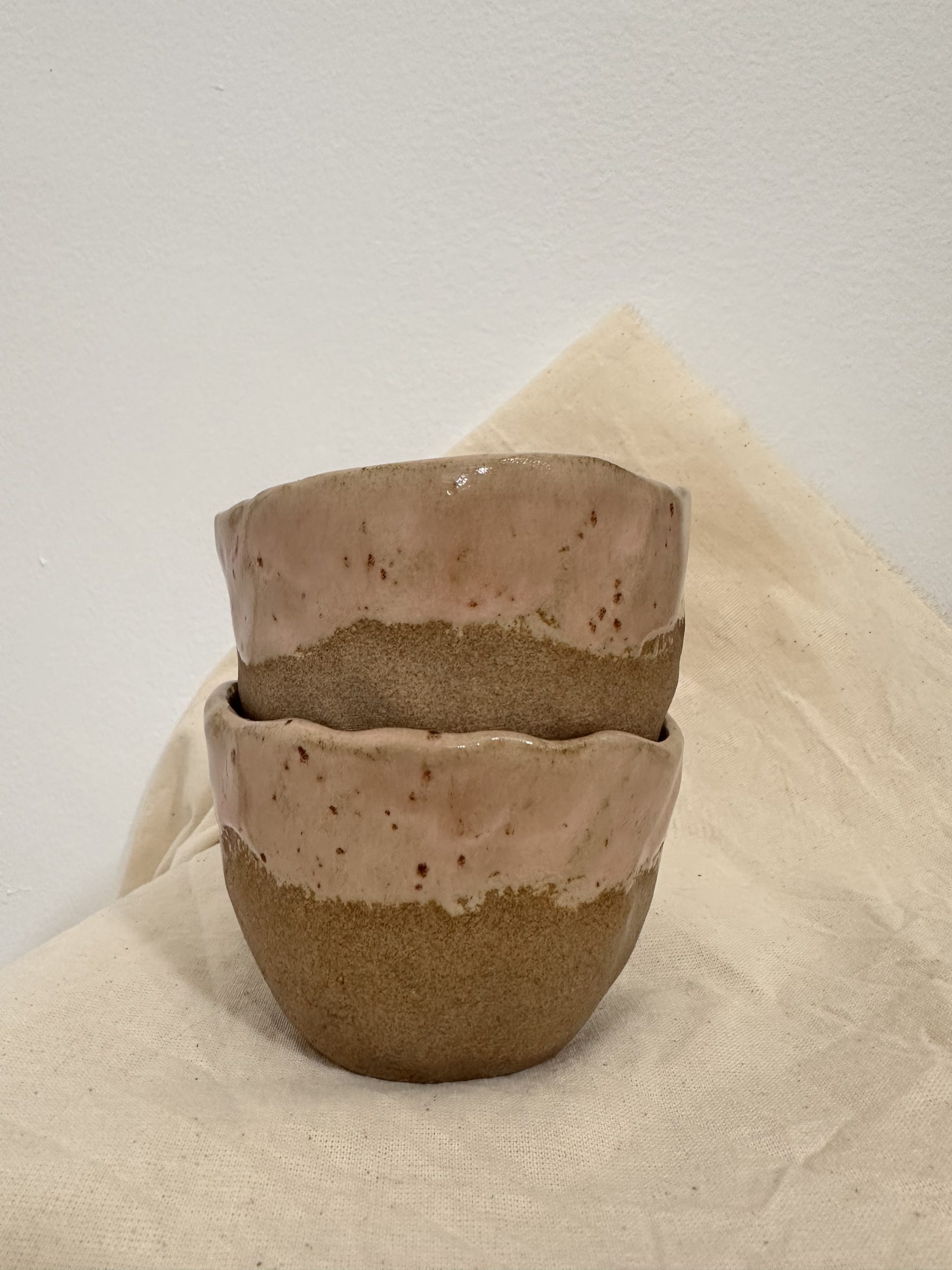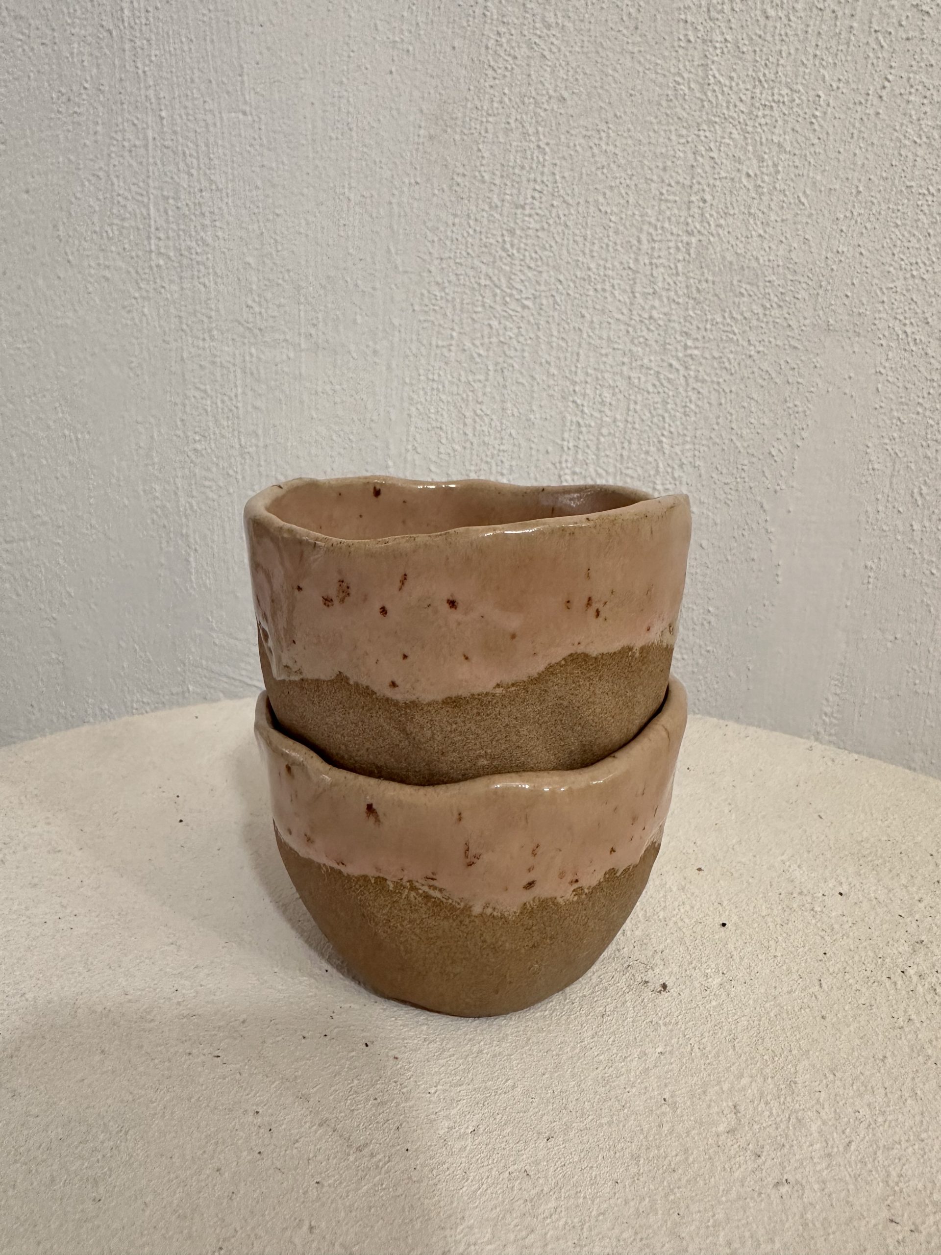 Taza tamaño Latte sin asa, barro de alta temperatura en color toffee y acabado esmaltado rosa o amarillo, tonos pastel